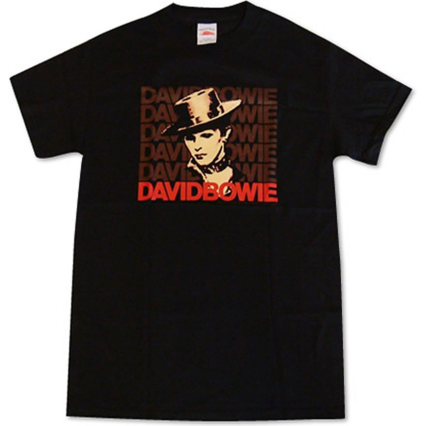 黒色のTシャツにこげ茶色で「DAVIDBOWIE」と5つ、赤で1つプリントされています。全体的に落ち着いていたデザインなので地味目が好きなにオススメです。
