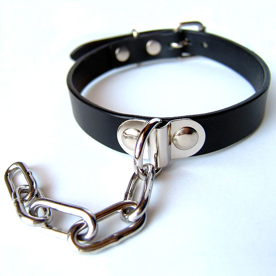 パンキッシュなチェーンが目を惹くハードなデザインのネックバンドです。留め具はベルト・タイプで、29~35cmの間で6つのベルト穴による調節が可能です。